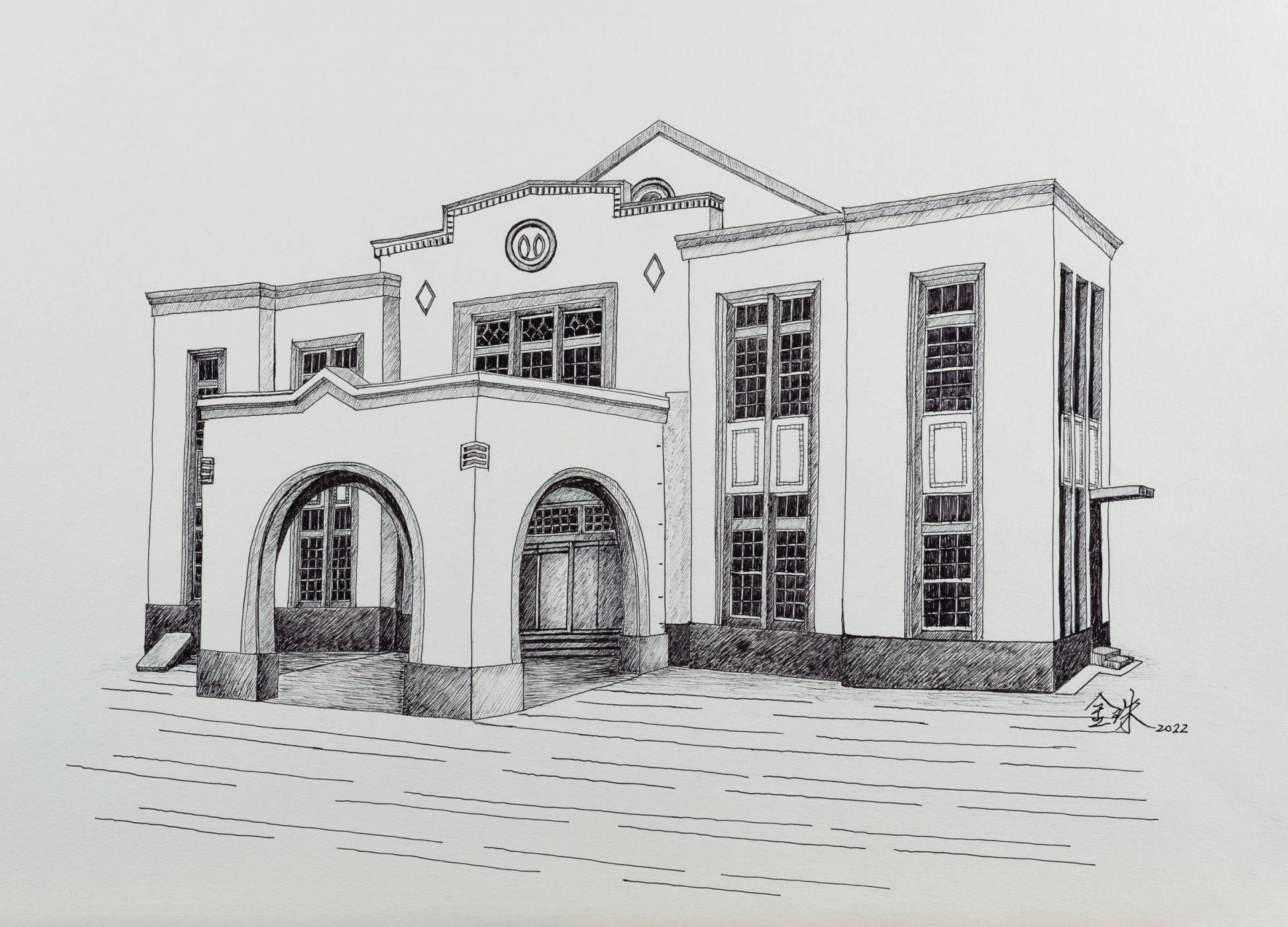 鋼筆畫源自於西洋美術的傳統技法,剛勁流暢、黑白分明的線條,又能依下筆速度與力度區分粗細,有其獨特美感與趣味。對於建築繪畫作品而言,鋼筆畫能更流暢地表達建物的線條、稜角及外觀特徵。 曾任彰化縣長、文建會主委的翁金珠,在公務之餘,將原本批公文用的鋼筆,作為日常繪畫的工具,她的繪畫主題有花草植卉,也有對於市街裡老建築的紀錄。在她出身的彰化縣,數百年歷史的老城裡,建築群承載著人們生活的軌跡與記憶,也成為她作品描繪的對象。本次展出的作品,從翁金珠多種多樣的城市建築畫作中,選擇八幅台灣各地的公會堂參展,也與展出場域相呼應。她筆下的公會堂,寄託了她對於文化、土地和鄉土的關懷。公會堂的興起來自日本時代公共空間的需求,是常民日常生活休憩、聚會和參與文教育樂活動的地方。而公會堂建築映射了時代下的建築風貌,如建築中的拱窗、圓拱及浮雕等元素,來自建築史上 的西洋歷史式樣;而許多幾何形狀的飾帶和窗型,則是名為 Art Deco 的風格裝飾,多出現在折衷主義類型的建築中。