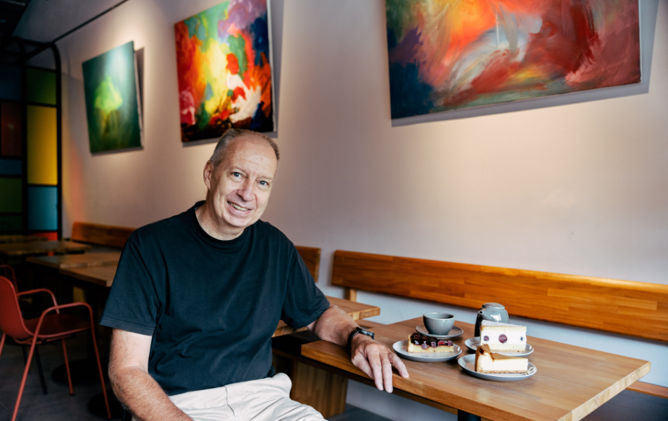 除了烘焙,Chris也對藝術領域非常有興趣。他神情驕傲地與我們分享「店內布置在牆面上的畫作,都是我自己畫的!」我們詢問Chris會想開甜點店、畫畫到什麼時候,他的雙眼立刻亮了起來,說道:「要做一輩子!」他的繪畫作品內容偏向捕捉內心抽象的感受,用色豐富且鮮豔明亮,多使用寬大的筆刷疊加顏料,豪放的筆觸讓每一幅畫作都充滿生命力。對Chris來說,烘焙與藝術都是他十分熱愛且願意用一輩子去努力做的事。