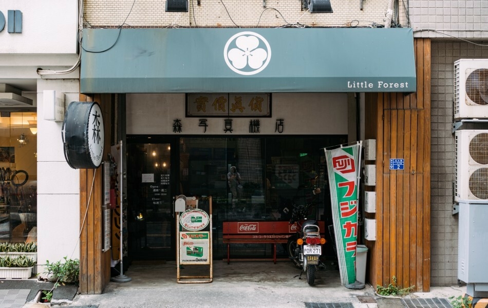 「森寫真機店」以木作為主要視覺元素的店面外觀,搭配森綠色的招牌,擺放著紅色長椅及FUJIFILM 立牌,看似不經意的物件擺放,潛藏著對生活的細節講究。黝黑發亮的雙眼底片相機、色彩鮮豔的底片捲一字排開,猶如森林一般,眾多底片玩家們,在琳瑯滿目的相機叢林中探索與尋覓那台命定的相機與膠捲。