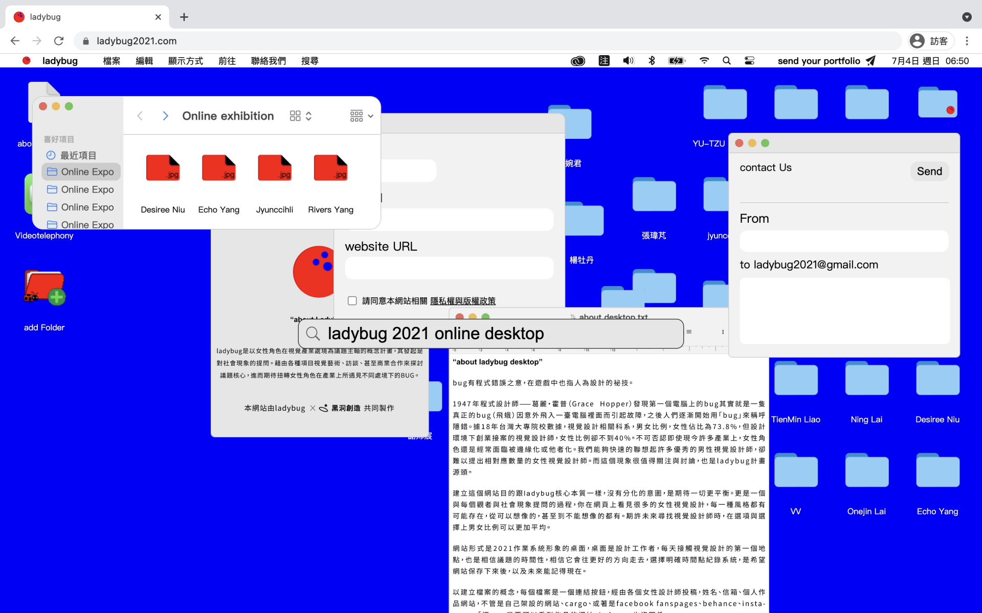 一連串疑惑許久的問題:為什麼很多優秀的女性設計師沒有被看見?為什麼受到關注的設計師大多是男性?提出問題後,Ladybug 計畫便展開行動。2019 年,推出《Eyes On Her: Girls Graphics—女子設計展》,集結優秀的女性設計師作品,將原先集中在少數人身上的聚光燈轉向,「看到更多(女性設計師的)作品之後,是不是會有不一樣的結果?看到更多選項,說不定就會注意到更多可能性。如果更多女性設計師被想到、被提起,設計業界的性別比會不會有機會自然變得均衡?」,李君慈說。Ladybug 也於2021 年開始一項長期線上策展計畫「2021 Ladybug online desktop」,歡迎女性設計師投稿作品與聯絡方式,讓這個網站成為人們接觸女性設計師的窗口。近兩、三年間,已經有越來越多女性設計師被肯定,她也期望Ladybug 計畫未來能夠拓展範疇,進一步討論女性設計師的生活平衡等議題。