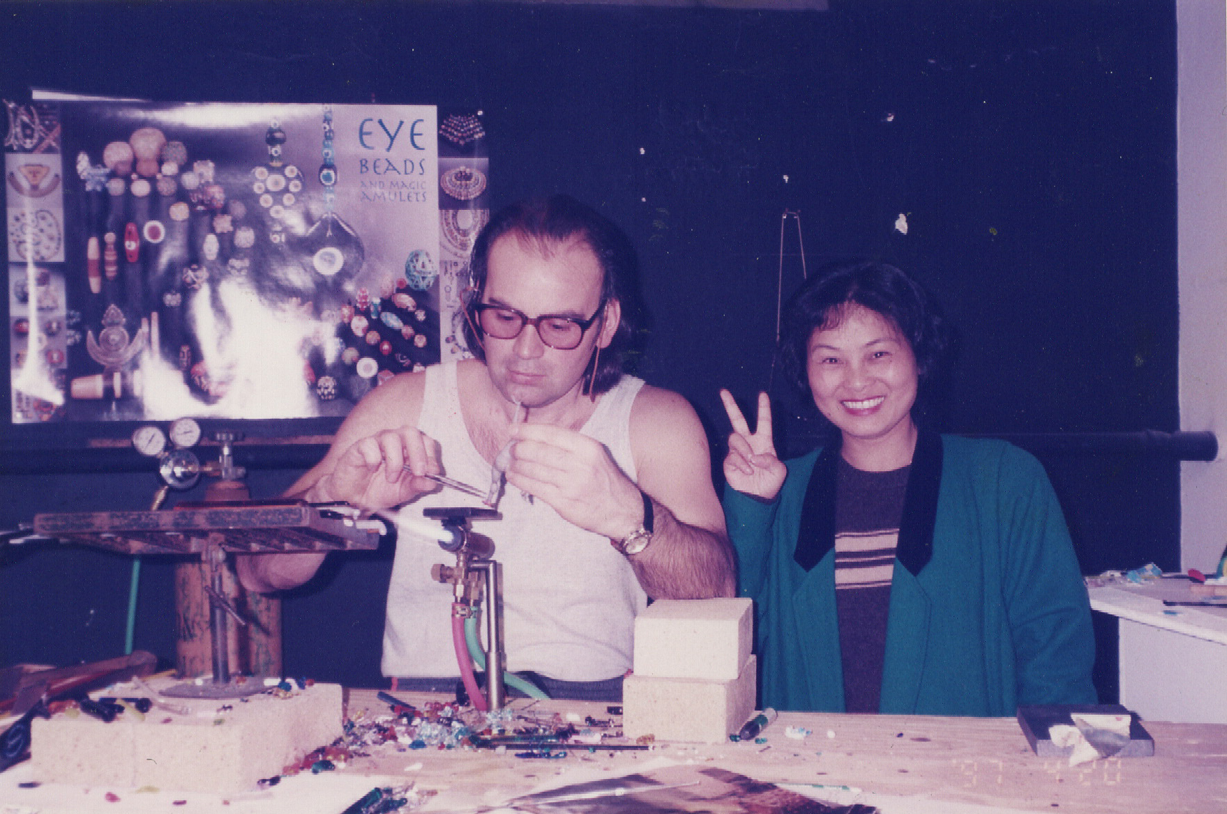 陳秘書曾擔任新竹玻藝節的國際作品負責 人,在推動文化工作期間,結識來自各國的藝術家,也多次進行國際策展實務交流。 圖為 1995 竹塹國際玻璃藝術節參展藝術家 Lucio Bubacco。攝於西雅圖「Pilchuck Glass School」。