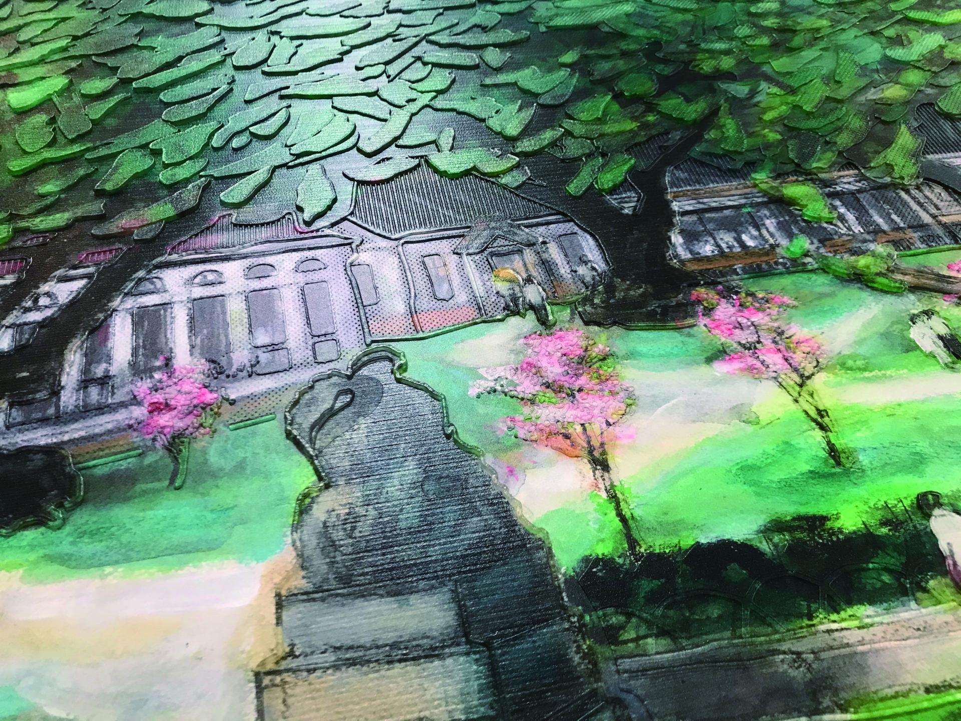 本館將館藏李澤藩老師的〈社教館古風貌〉設計為可觸摸的輔助教具,搭配口述影像後,即使視力受損也能感受到畫作的面貌。