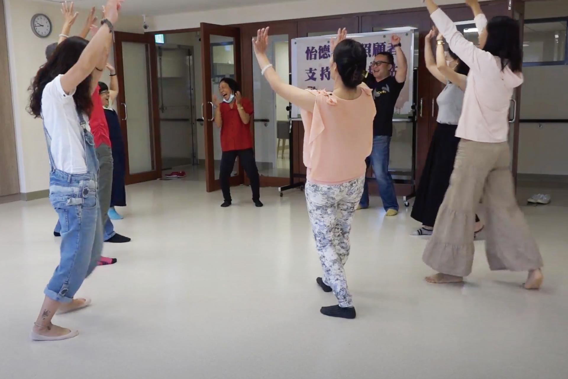 家照者於寬福護理之家參加即興劇工作坊,成員分享自己在工作坊的學習過程心得。彼此相互傾聽下,形成一幅溫暖的圖像,也凝聚了成員間的情感。圖片為徐紫柔導演提供。