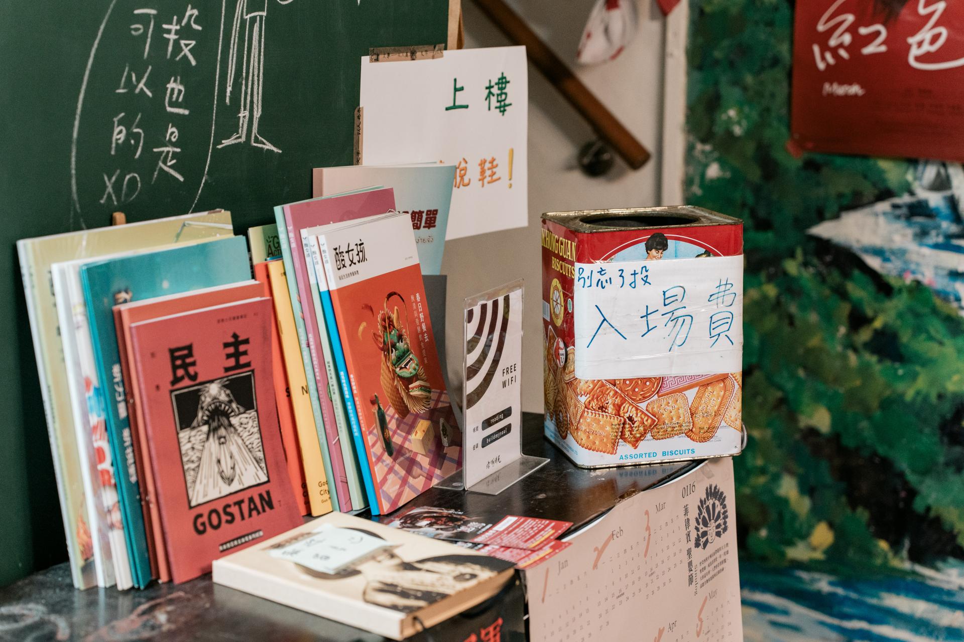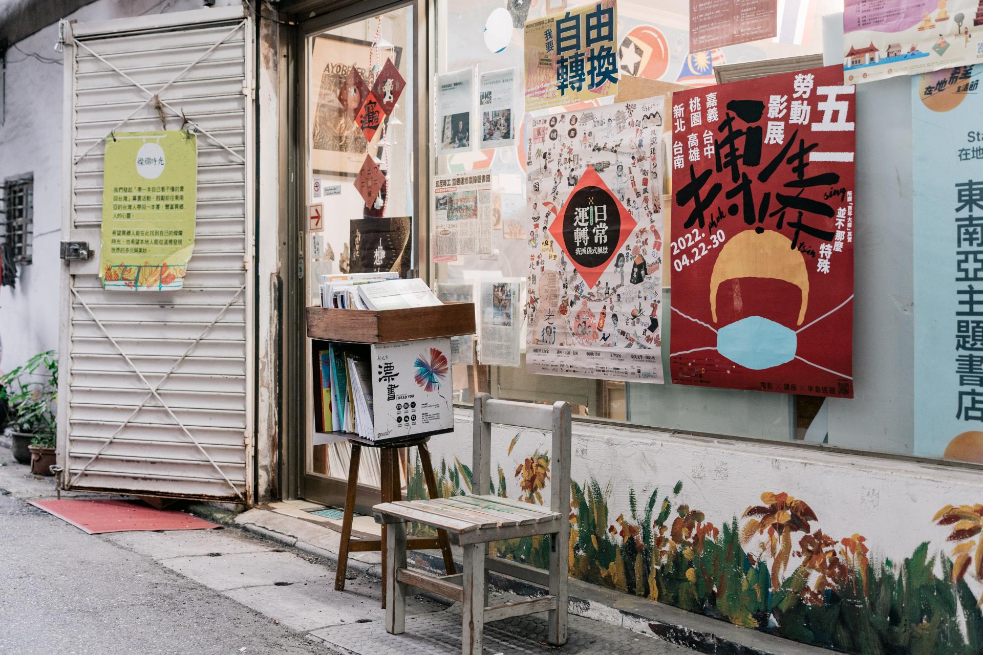 燦爛時光的店門,張貼著各式活動海報,還有店內的漂書箱,歡迎路人們自由取閱。