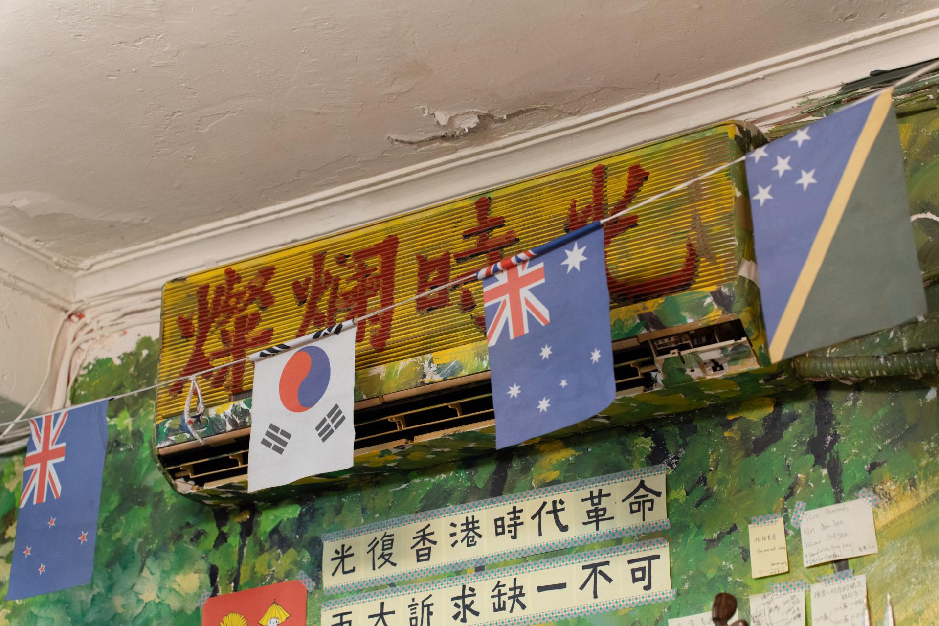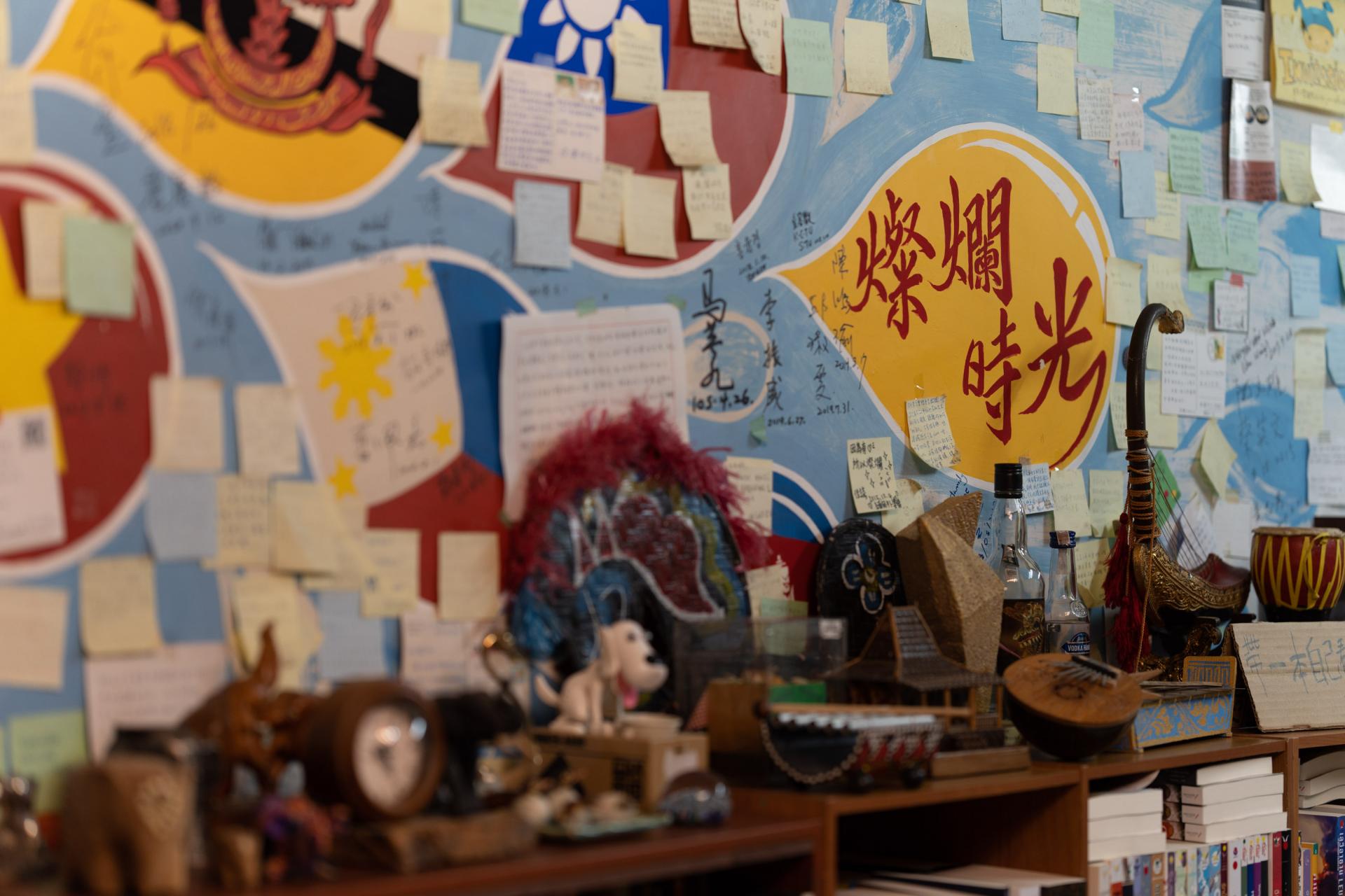 燦爛時光書店的招牌牆面,以潑水節的水花意象象徵各國聚集在台灣。