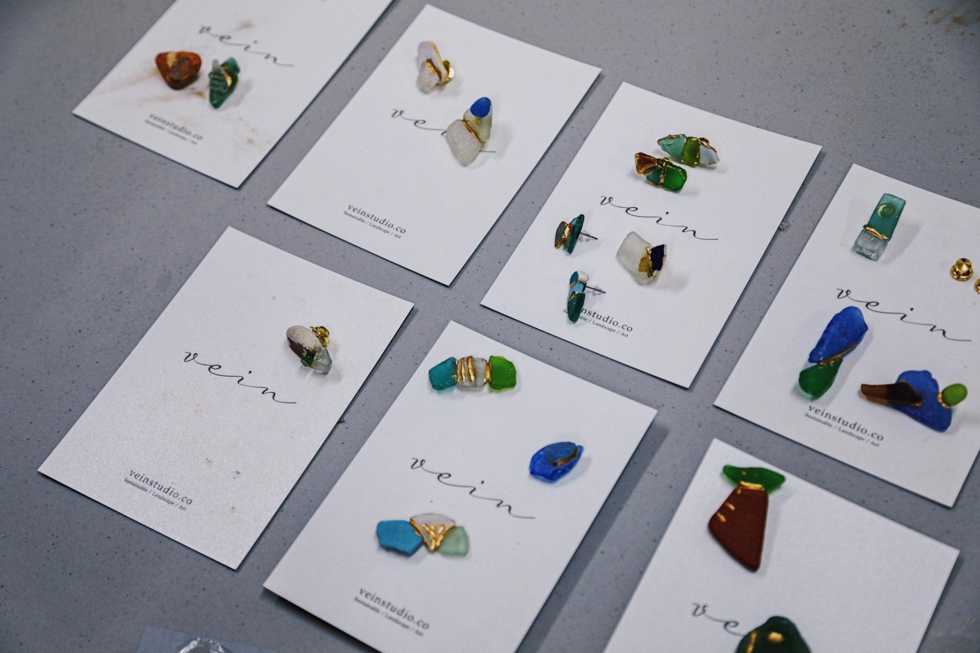 「金繼玻璃首飾工作坊」帶領學員從挑選玻璃、組合、塗膠與撒粉的過程,認識為廢棄玻璃展開全新章節的永續理念。