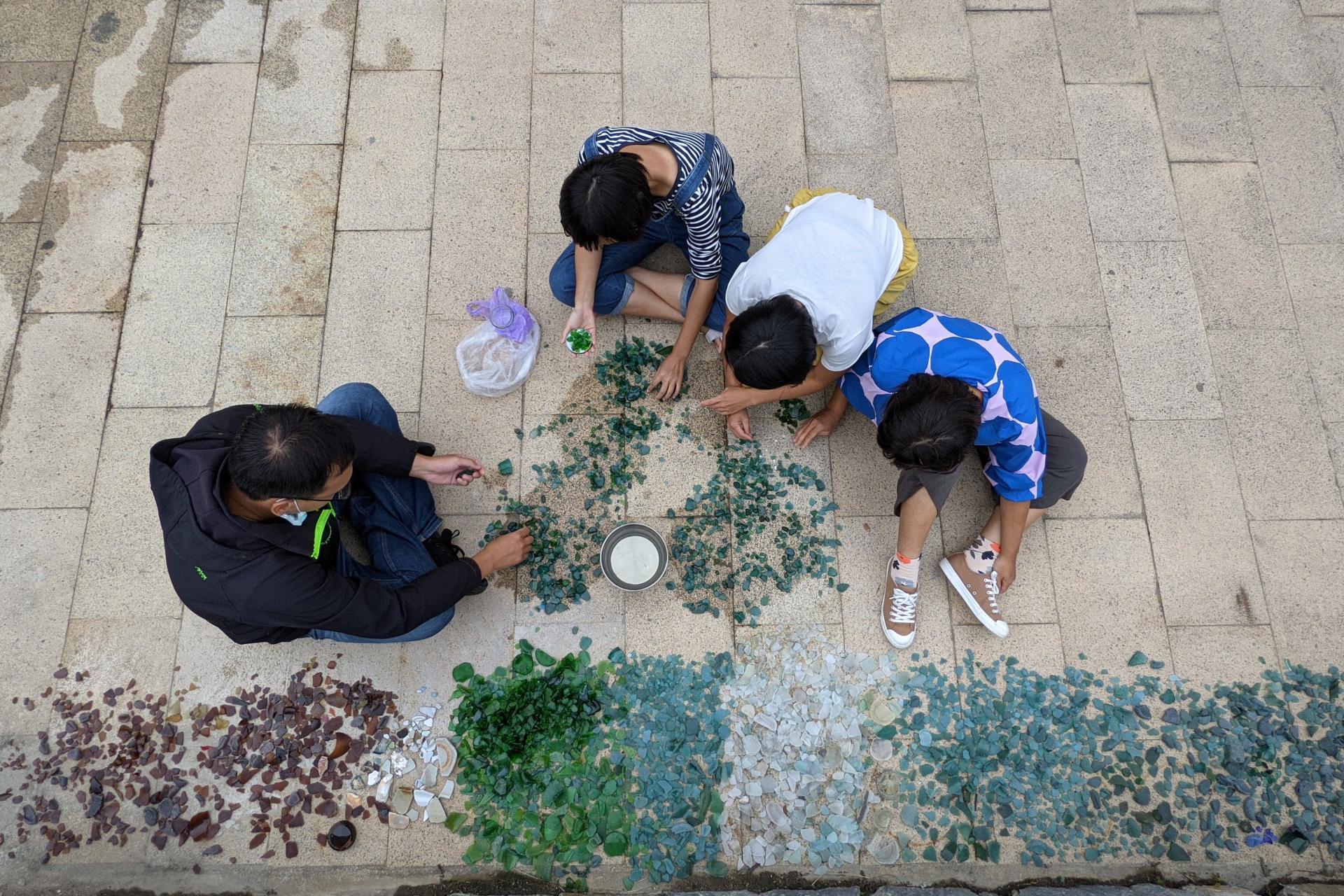 參與公共藝術創作計畫的馬祖青年們,先將採集而來的玻璃分色、清洗之後,才能點綴上砌石牆面。
