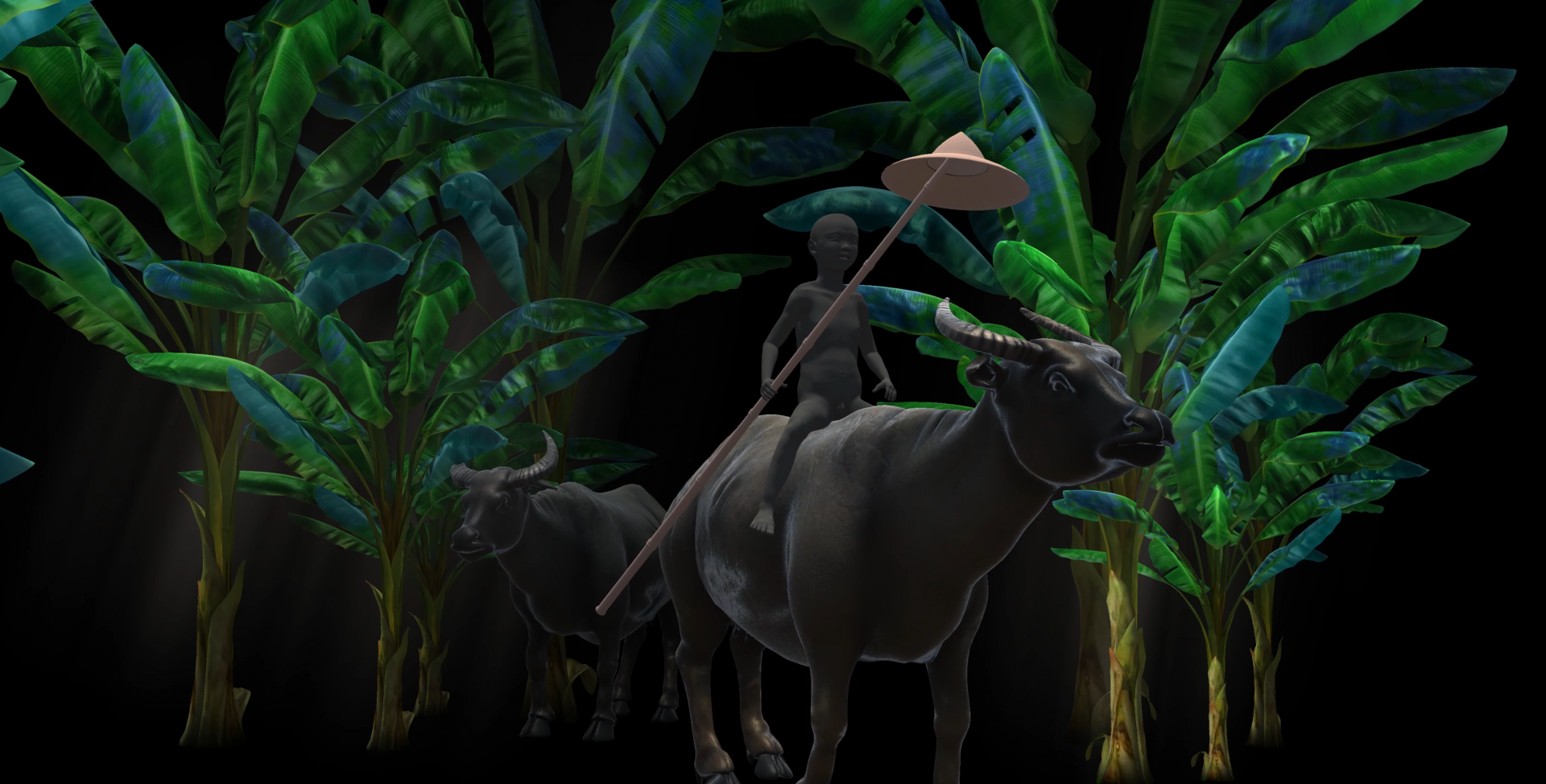圖為國美館在另一場展覽中使用3D動態技術呈現的國 寶級作品《水牛群像》。(圖片提供:國立臺灣美術館)
