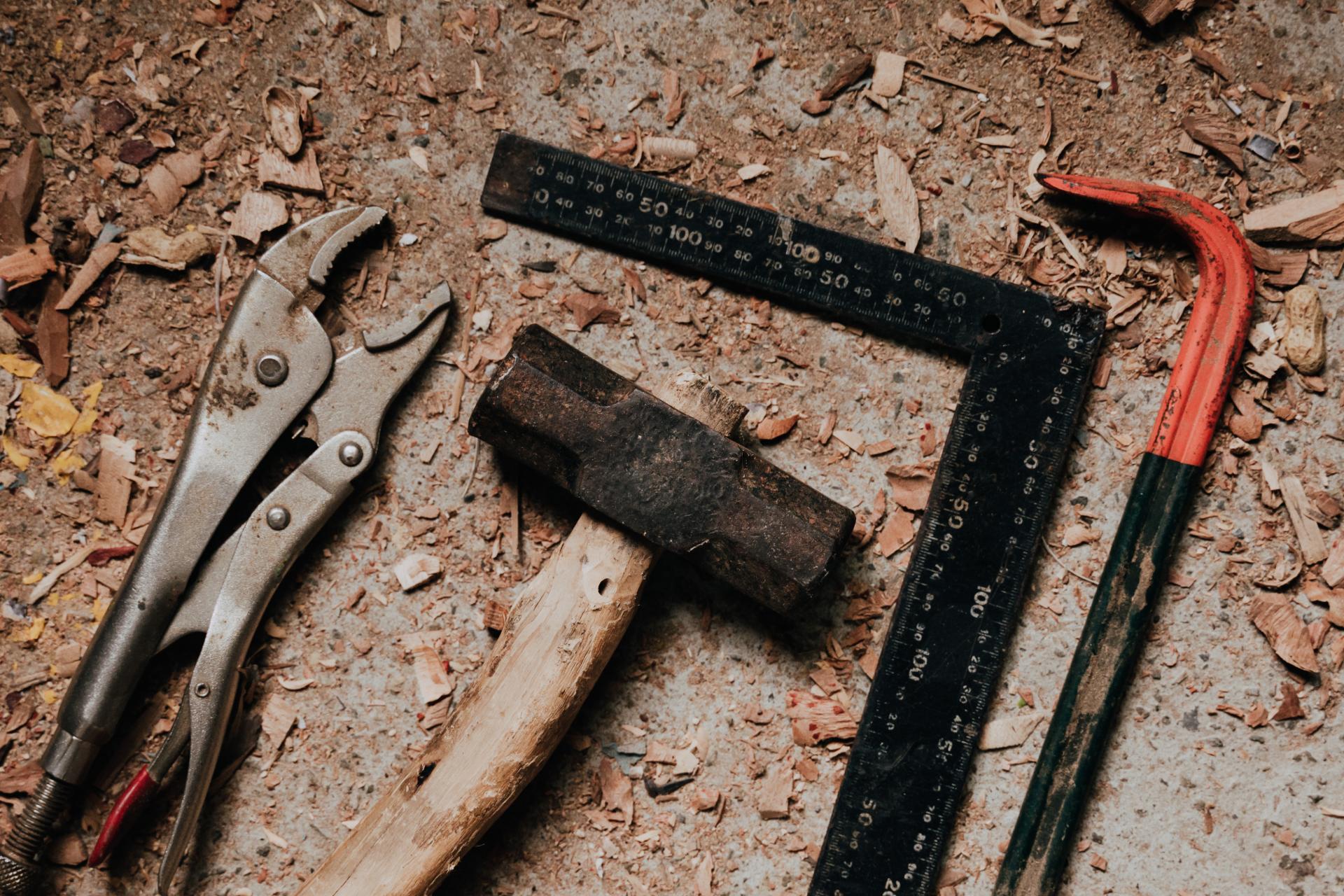 蔡楊吉老師平時進行創作時常使用到的工具,包含錘 子、量尺、鉗子等。