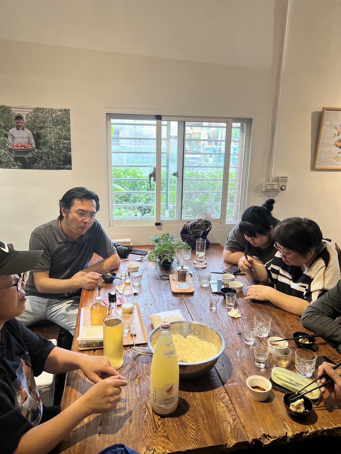 在朱美虹開朗且自在的談話間,很難把這樣的笑靨連結到「土地革命」如此重的議題,她更笑著說:「那些沉重的交給青松,讓他去說!」然而,朱美虹自學生時期便與社會議題有相當程度的鏈結,例如她曾參與 1987 年於高雄的反五輕運動,出社會後也一直對土地議題有所關注;選擇在深溝村構築「新農村生活」,也是對土地議題的實踐。朱美虹說:「關於土地,務農不是唯一。」朱美虹充滿能量地說起充滿轉折的生命經驗,問到都是怎麼樣做出決定的?她一派輕鬆卻堅定無比地說:「我的心裡就是會有那個畫面,然 30 後我就想讓它實現。」朱美虹認為,時代已經變了,農村人口流失、務農人口下降是事實,走在這條路上不能一天到晚板起臉講革命,她用一個有趣的 比喻來分享自己對於土地革命、新農村生活的推進:「明明越來越少人下廚的現代生活,為什麼還是有那麼多的美食節目,或者 是做飯的短影片在串流平台上?為什麼大家不會煮飯還是愛看別人煮飯?」朱美虹接著補充,因為美食、親土是很直覺的幸福畫 面,會讓人在充滿壓力的現實生活中,腦中有個聲音:「也許有天我有空,我也能這樣做呢!」朱美虹認為,那樣的想像就是一種幸福,也因此她選擇了文字和美食,透過寫書、經營餐廳、創建社群更輕鬆地接觸到人,能一點一滴的影響還沒能夠離開現實生活的大家,讓更多人有一份這樣對「新農村生活」的嚮往在心中發芽,這便是她對於土地革命的實踐——「讓大家知道,有天也許我也能過這樣的生活。」