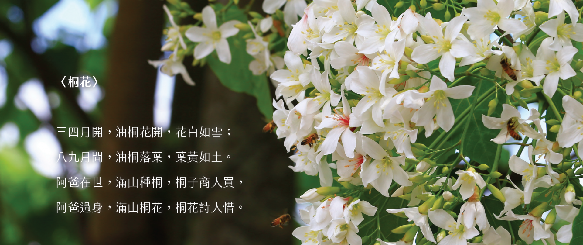 詩中並呈阿爸的生與死和桐花的開與謝,精練的字句、節制的語氣,隱含著臺灣桐油產業的美麗與哀愁。范文芳分享,兒時記憶中,母親和妹妹拾油桐籽售予商人,桐花和生計密不可分,而桐花背後,更有一段跨越時代的歷史故事。日治時期政府引進油桐和梧桐,發展桐油產業,又以桃竹苗山區為主來種植,客家族群和桐花的關係,或可追溯至此。來到戰後,救國團的愛國教育活動中,卻流傳著一種說法:「臺灣人用桐油的油欺騙日本商人為梧桐的油,因此日本不再跟臺灣交易桐油。」意圖用陰謀論激起民族仇日情緒,弔詭的是,未曾離開此地生活的人和客家文化卻在意識形態下身處夾縫,難以發出自己的聲音。