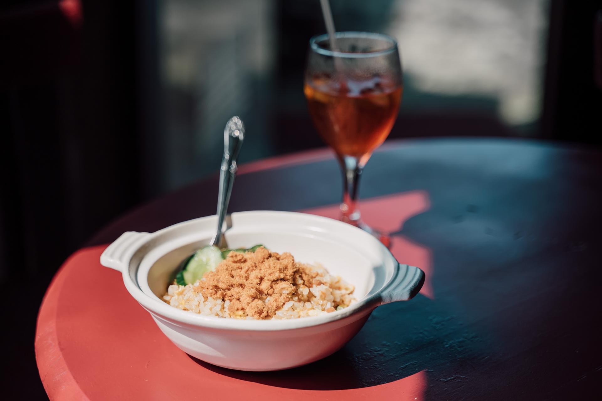一行人熱鬧聊天之際,一位佝僂阿婆從後場走出,端出熱騰騰的炒飯。炒飯裝在砂鍋中送上桌,盤緣擺著小黃瓜裝飾,表面還鋪著一層肉鬆——細節裡滿是帶有藝術感的日常和溫度。