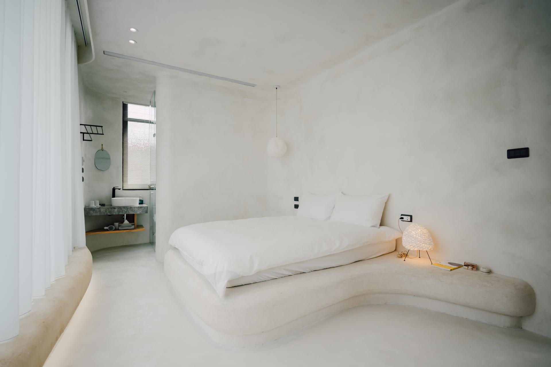 「山嵐」房發揮巧思,融合泥土與自然礦石為塗料重新改造,轉譯山間雲霧的意象為空間語彙。