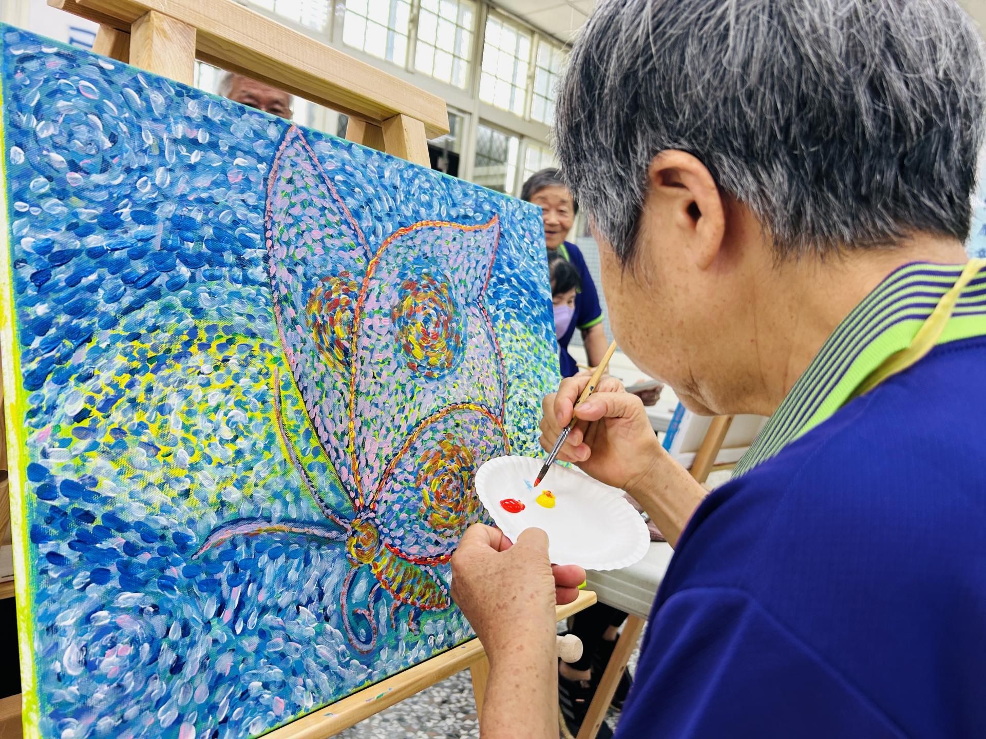 除了題材,課程在創作技法與色彩呈現上,也處處有劉英華發揮美學品味的設計。細看長輩的作品,將發現看似連綿的線條是以無數小點構成,這是考量長輩容易手抖而導入的「點畫」技巧,保留著高齡藝術家的獨特筆觸;在繽紛卻不失衡的色彩表現背後,也融入色彩設計的專業,每次作畫的冷暖用色,皆經過初步篩選才讓長輩選擇,造就作品之間視覺上的完整和一致,同時保有繪者各自的風格。劉英華說:「做設計者最 care 的部分就是要與眾不同。所以當我拿出一張照片,如果能讓大家看這張圖,畫出不同的畫,變成不同的作品,我就覺得哇! 挑戰性和成就感非常高。」