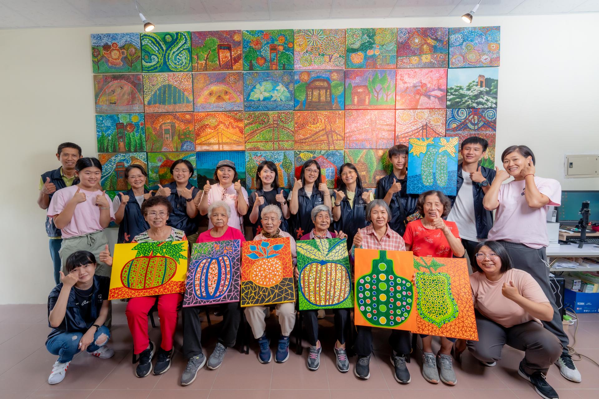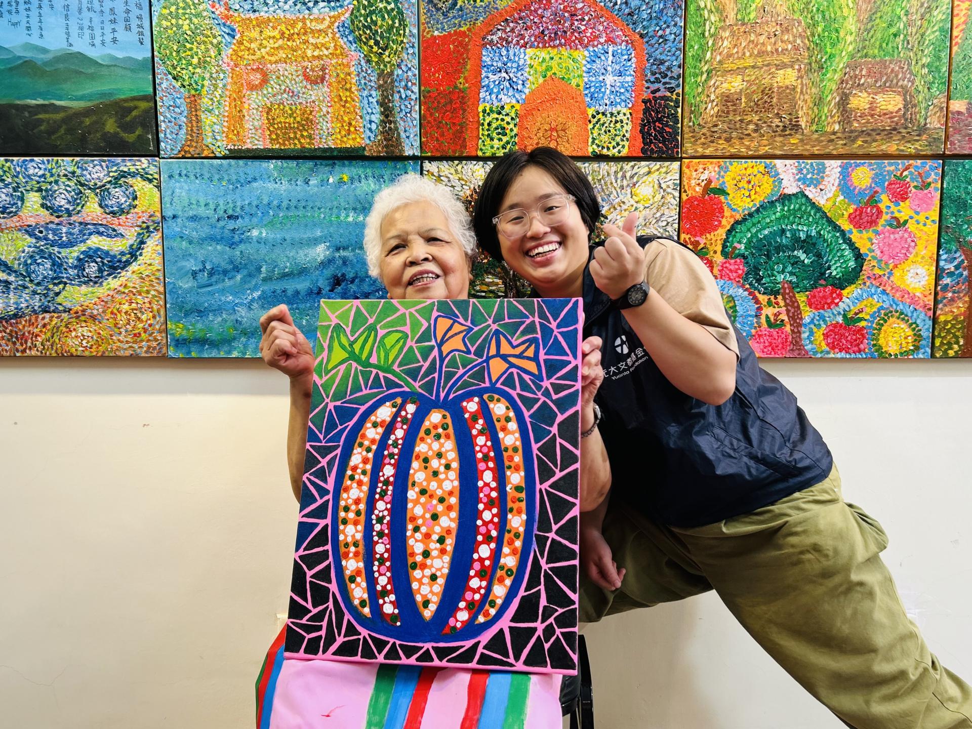 作為設計師的劉英華,感嘆許多社區的創作能量被一次性的美勞課程埋沒,他始終相信,須將創作目標提升至能夠展覽或轉譯為文創商品的質量,才能真正透過藝術,帶來改變。因此他帶領的課程多是二至三個月的創作計畫,依據各地關懷據點、長照據點的計畫內容,陪伴長輩繪出家鄉的物事和記憶中的風景。不過長輩畢竟未受過完整的美術訓練,如何帶他們畫得開心又有成就感呢?在創作題材上,劉英華一面借用名畫的風格美感,一面從阿公阿婆的生活經驗尋求靈感。為了尋找長輩共鳴的題材,他笑說自己常像偵探,在開課前深入調查農村長輩的一日生活。過去曾以梵谷星夜畫風,呈現南庄景點的四季風景;去年更推出草間彌生風格靜物畫,色彩紛陳的瓜類,取材自每天例行照護農園的阿婆日常。他打趣地透露,下次的主題打算挑戰以「野獸派」畫風,演繹阿公阿婆身邊的貓貓狗狗。