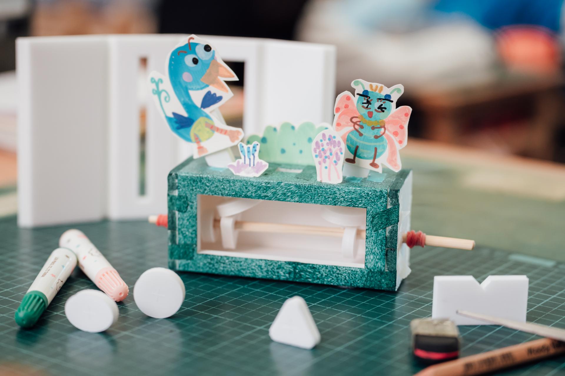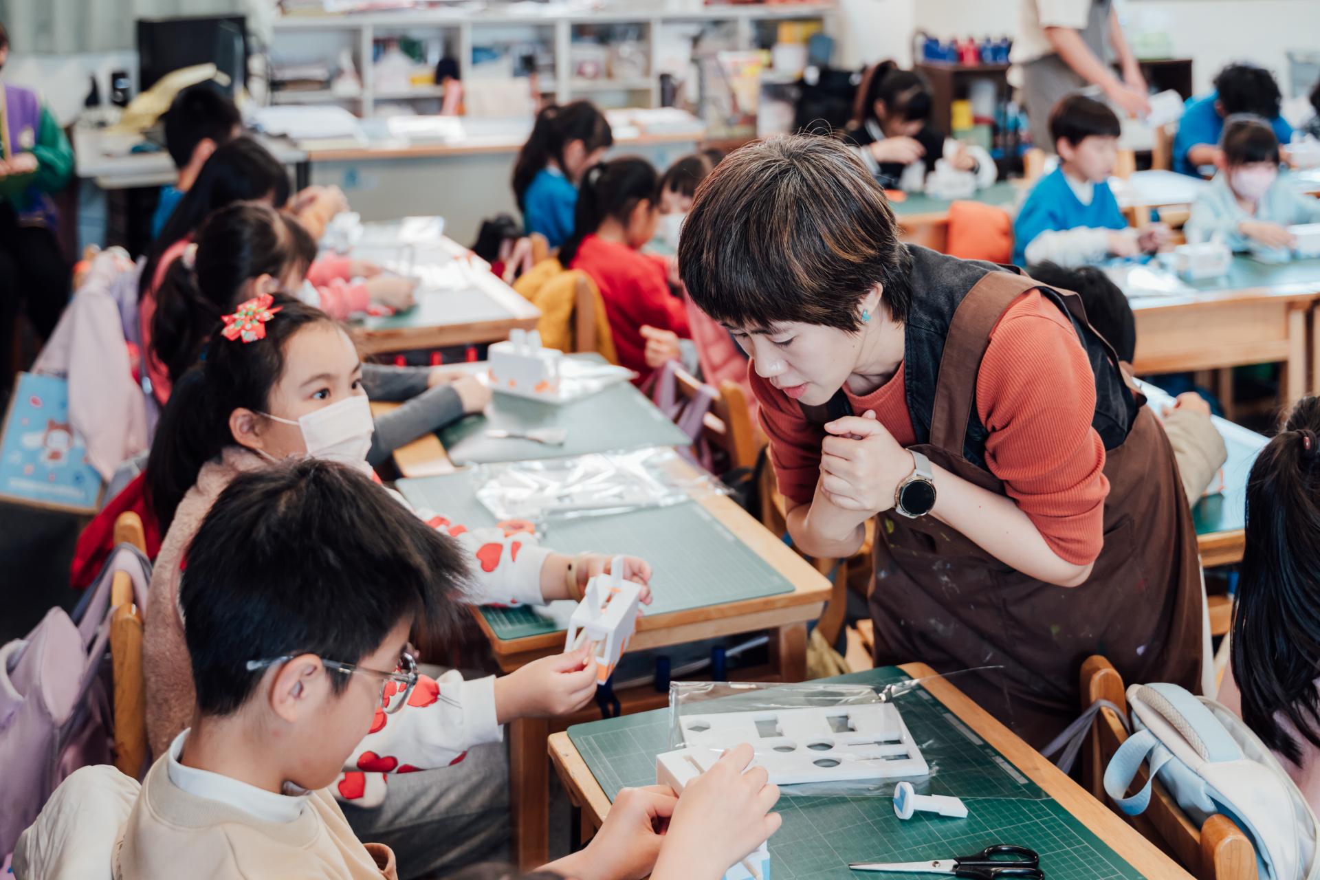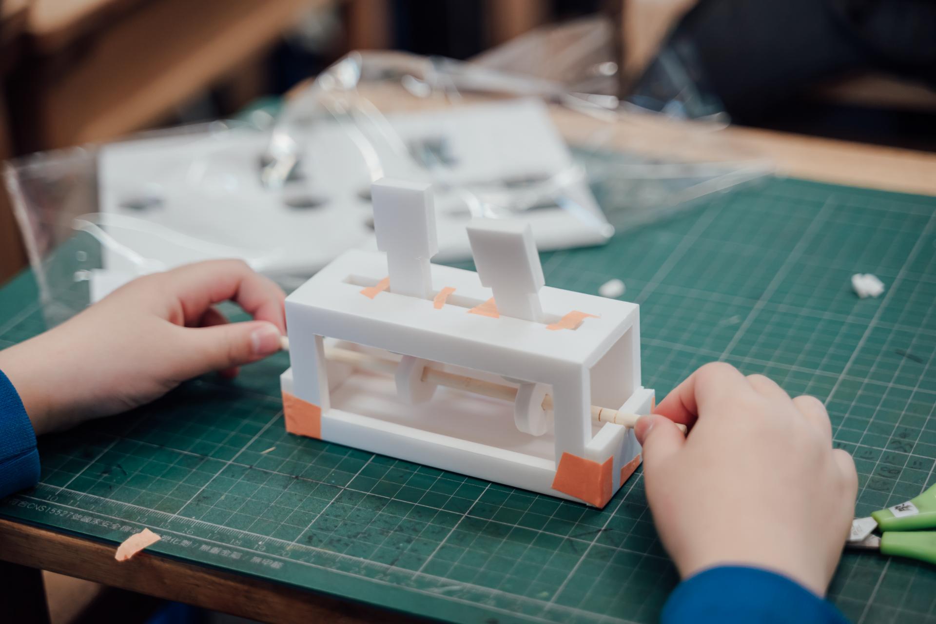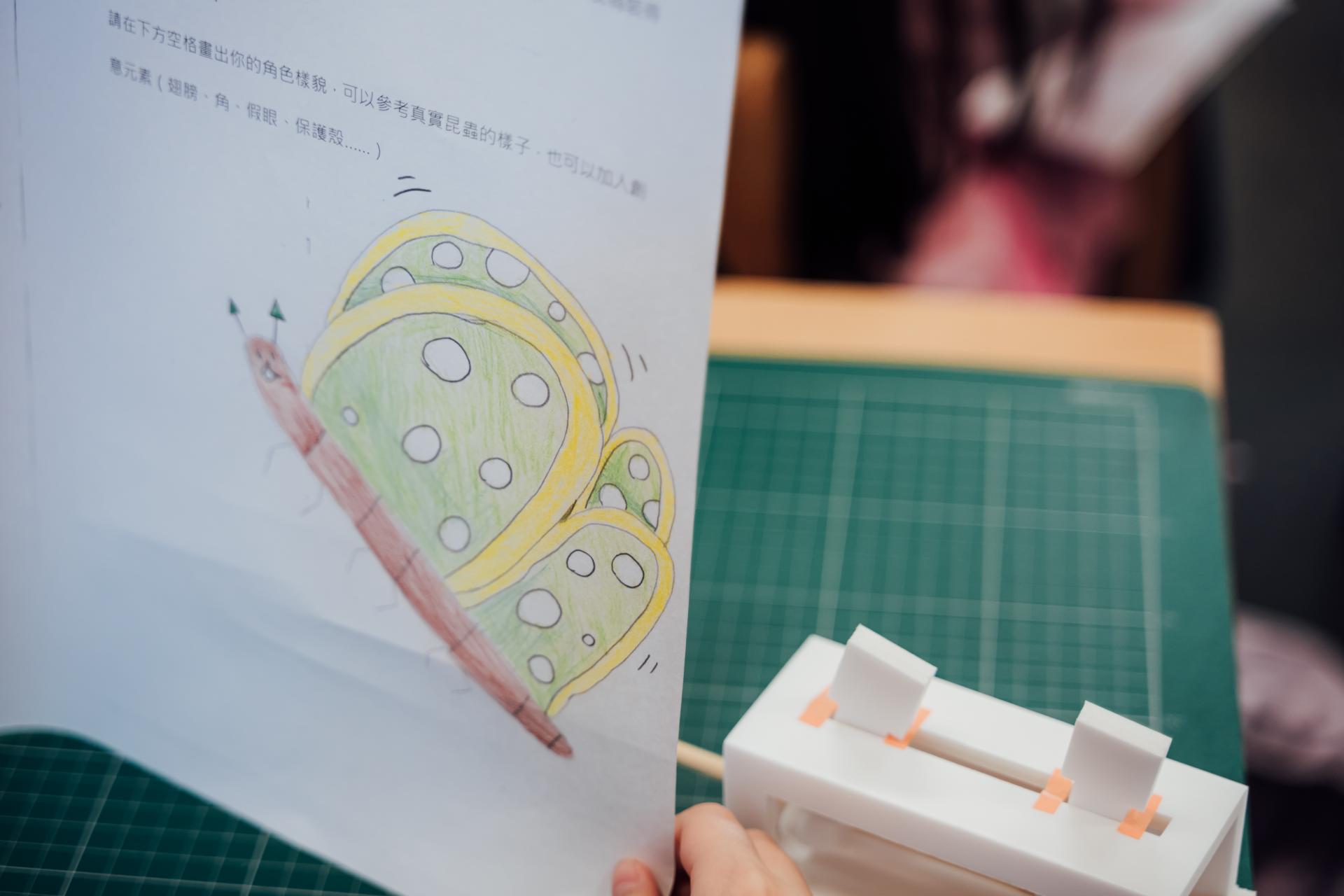 接著,林欣誼拿出不同形狀的輪軸,引導學生觀察這些結構如何帶出人偶不同的動態效果。孩子們很快發現,輪軸形狀一改變,動作的節奏與姿態也跟著不同。就在大家以為接下來要直接進入作品組裝時,林欣誼反而先拋出問題「要怎麼組裝?」學生們於是開始拿著材料翻來覆去地研究,有人腦筋動得快,很快想到只要換個角度就能卡進去,有人站在一旁觀察別人的做法,也有人認真提出「不然拆掉重做」的建議。孩子們在彼此討論中比較哪一種方法能夠容易理解,也一起思考如果手部操作沒那麼靈巧,是否可以換一種方式完成。等到整個簡易機械結構完成後,班導師再拿出學生上學期做過的學習單,孩子們看著自己原先設計的角色,進一步拿起色筆、圖畫紙與剪刀,把構想轉製成紙偶。直到這個階段,課堂才開始呈現出一般人較熟悉的「藝術創作」樣貌。
