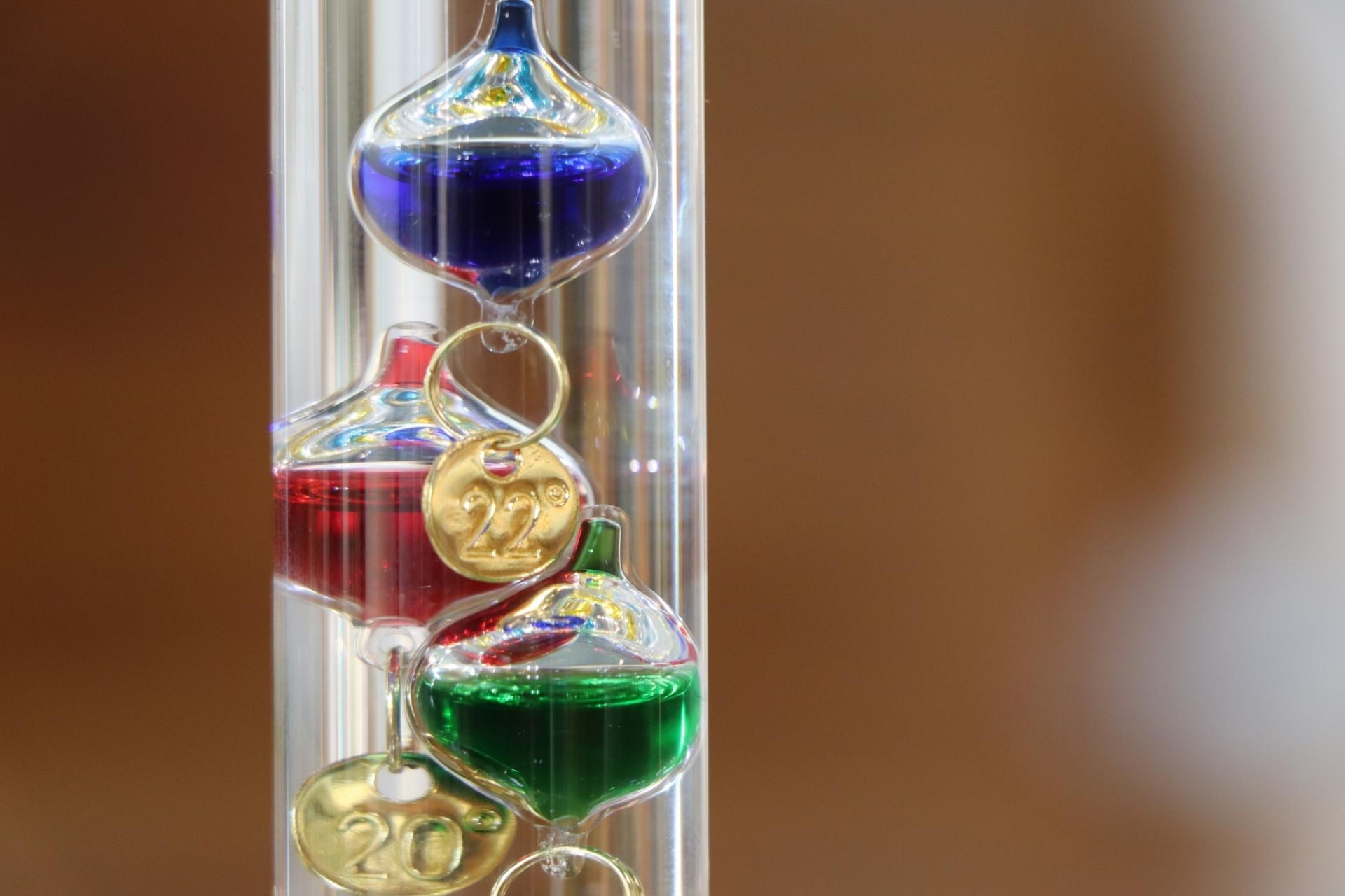 色彩繽紛的伽利略溫度計尤其吸引目光。透明管內懸浮著不同顏色的玻璃浮球,當溫度改變時,液體密度隨之變化,使浮球產生上下移動的現象,學生可透過浮球的位置判讀溫度,進一步理解其中的物理原理。