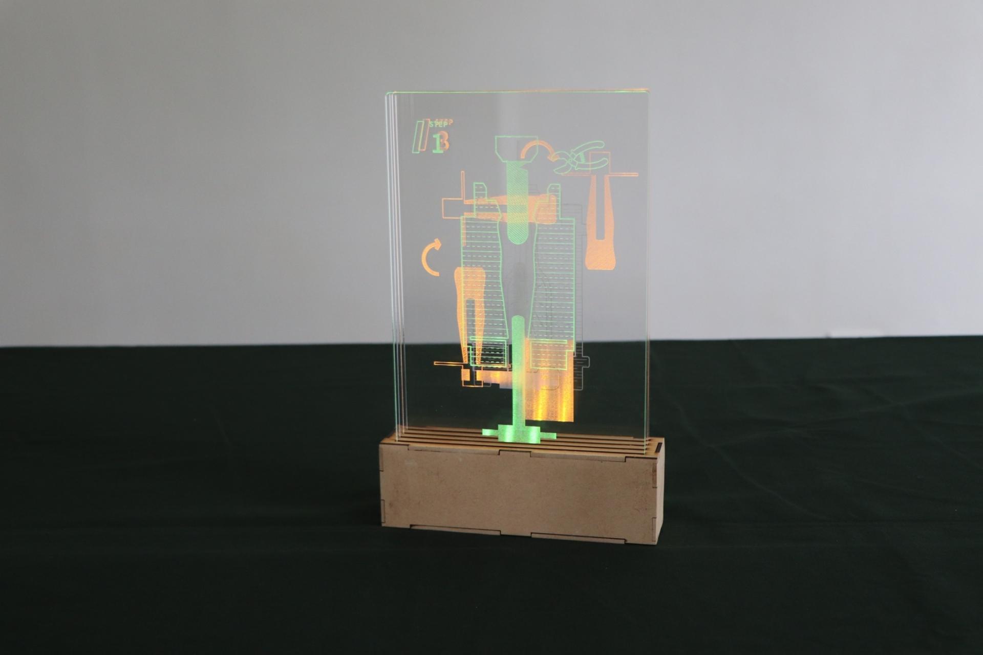 隨著產業逐漸式微,玻璃雖不再作為新竹市的主導產業,卻仍持續存在於當代生活之中。因此,在「生活玻璃」單元中,教具箱透過三項與日常緊密連結的教具,引導學生重新辨識生活中的玻璃應用。首先,透過鏡子理解玻璃作為材料所涉及的反射原理;其次,以常見的生活擺飾「伽利略溫度計」,觀察溫度變化與物理現象之間的關係;最後,透過「機械鋼模吹製步驟光箱」,演示將玻璃膏置入金屬模具中吹製成型的過程,使學生理解如米酒瓶、可樂瓶等日常容器,是如何被大量並規格化地生產而出。