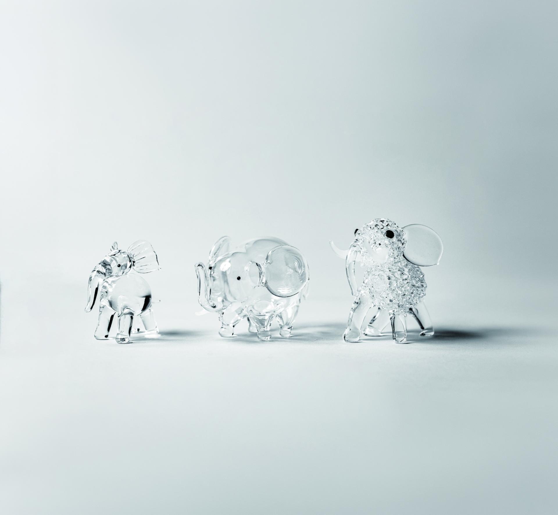 教具箱中的三隻大象,代表不同加工技法,分別為實心玻璃、空心玻璃、拉絲玻璃。