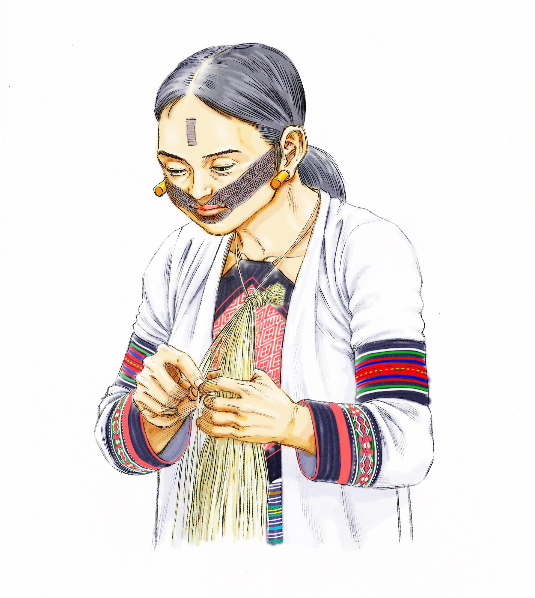 過去對泰雅族人來說,織布是女性必備的技藝,然而尤瑪老師說她的外婆十幾歲以後就不曾再織布,從外婆、母親到尤瑪老師這一輩,當時部落裡有一兩個人會織布已經很不錯了。然而這項文化為何會出現斷層?最早可以追溯到日治時期的皇民化政策,族人的織布工具被沒收,強韌的麻布料就被拿去製成軍用布,族人們穿上和服、改成日本姓名,而傳統服裝被丟棄、燒毀,原有的民族文化就這樣被外來政權強硬地取代。而國民政府來臺後推動山地平地化,族人身上的衣著又從和服變成西式服裝,以求融入社會大眾,傳統文化、母語便是與時俱滅。「殖民者希望你變成日本人或中國人,但沒有人說你可以恢復成傳統泰雅人,在那個時代氛圍裡,你就會丟棄原來民族的認同。」尤瑪老師細數那些過往,當她決定尋回自己的文化時,已經沒人在做這些事了,因此她必須從頭抽絲剝繭、理出頭緒,彷彿也預見將要面臨的重重困難。