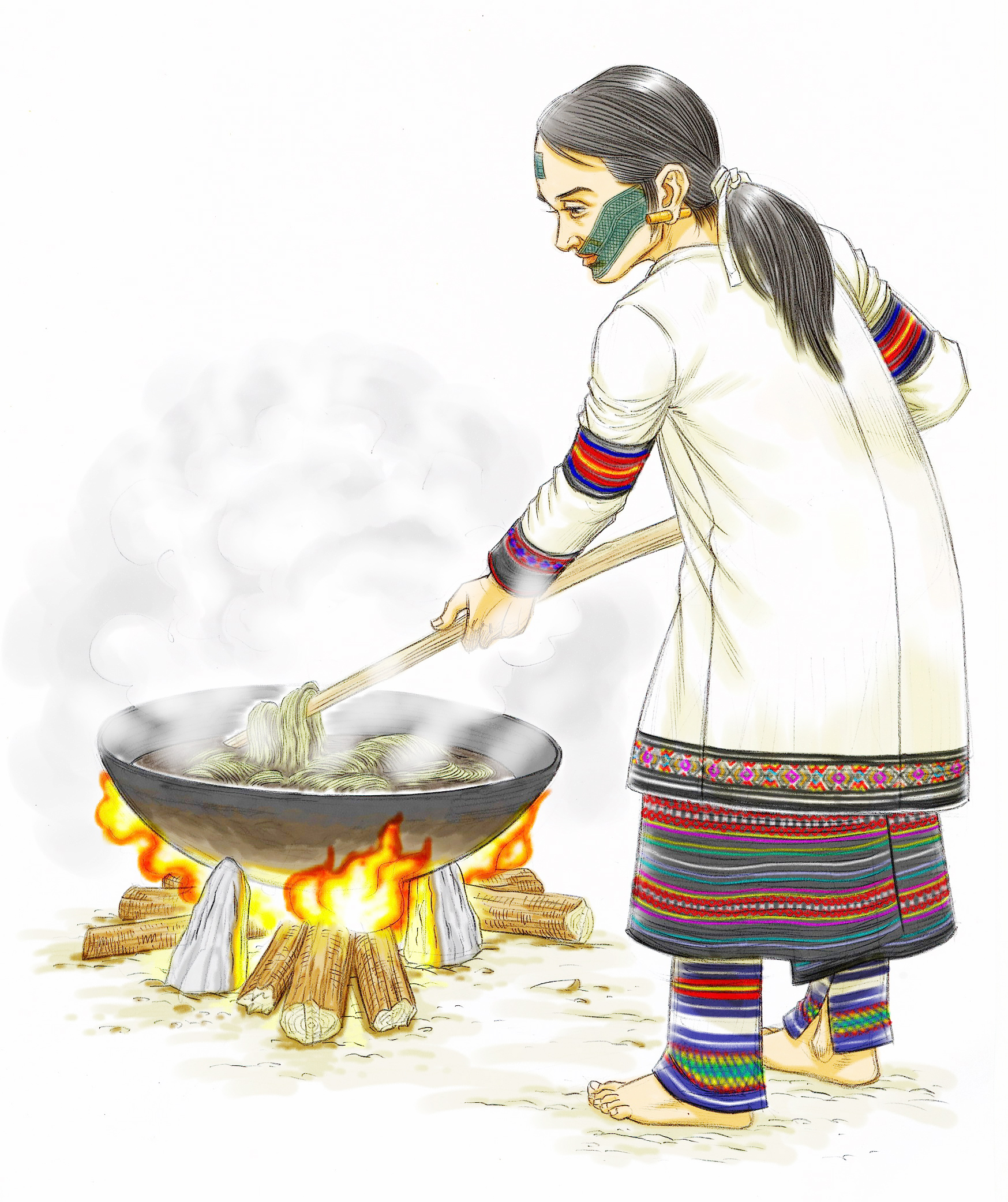 將線材入鍋並加入草木灰拌煮以去除線中雜質,有利於後續染色時容易上色。過程中必須不斷翻攪線材,避免底部燒焦。若煮過仍覺得不夠白,可晾於戶外藉白天日曬和夜晚的露水交替進行自然漂白。