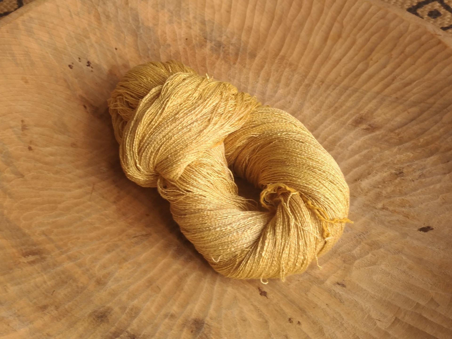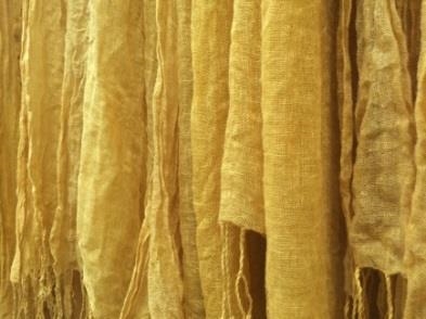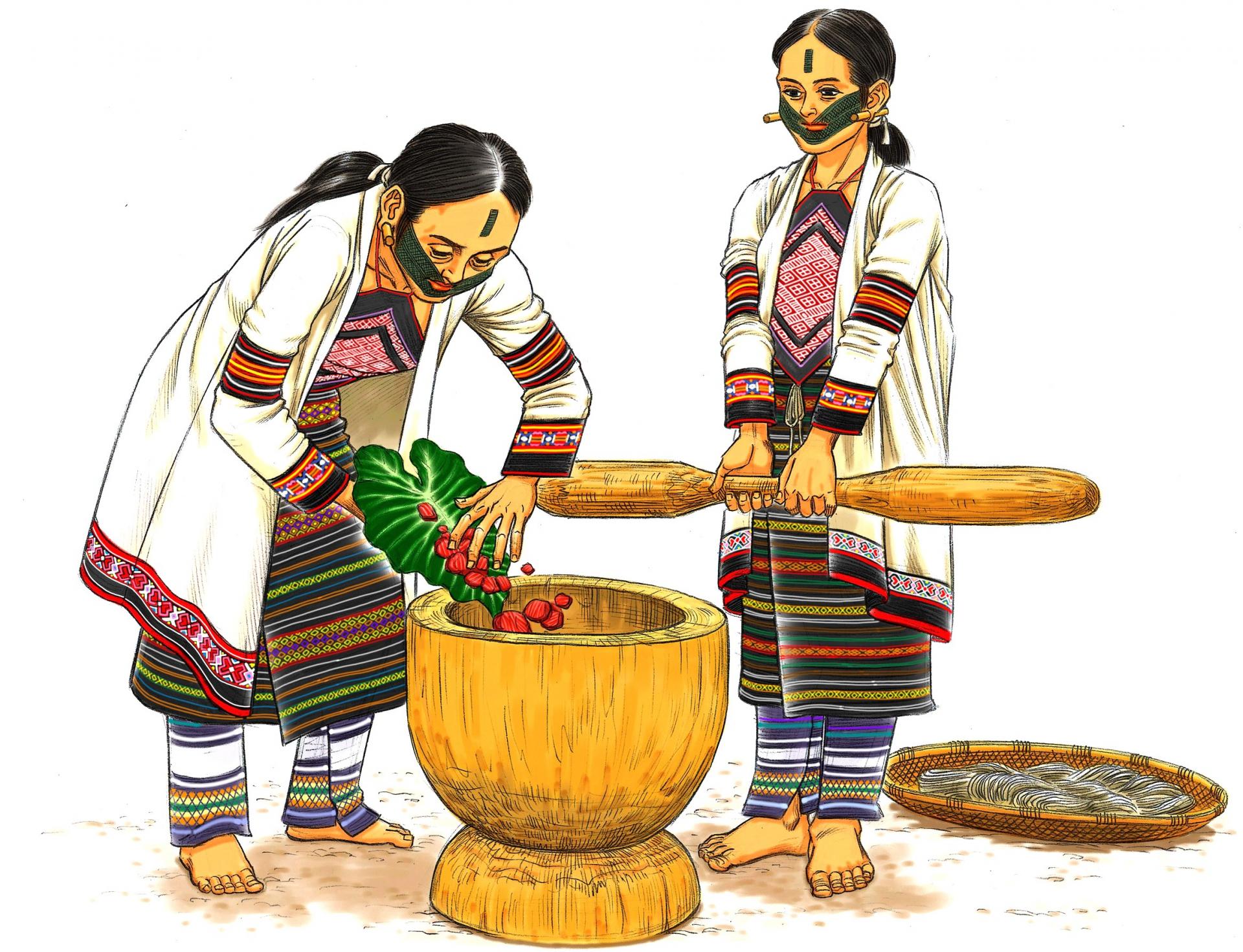 處理植物染材,例如:將薯榔及薑黃根部削皮、切塊, 放進杵臼搗出汁液,去除渣淬後將紗線浸漬在汁液裡染色。染後的線漂洗後須日曬或陰乾,薯榔染適合日曬加深顏色,薑黃染則建議陰乾以避免掉色。