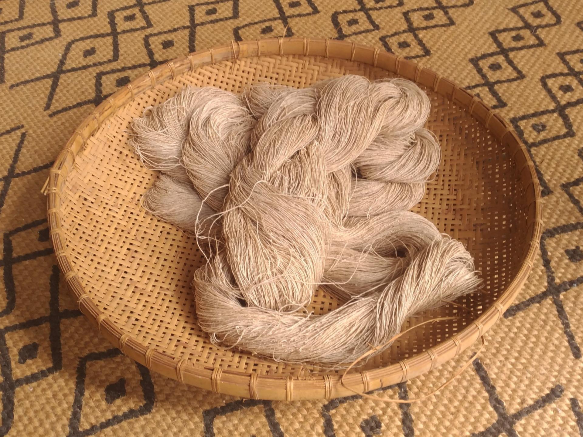 將纖維兩頭扭轉捻緊,連接成連續的長條,反覆此動作即可將線累積接長。並將苧麻纖維條,在手掌形成小束收集成捲。
