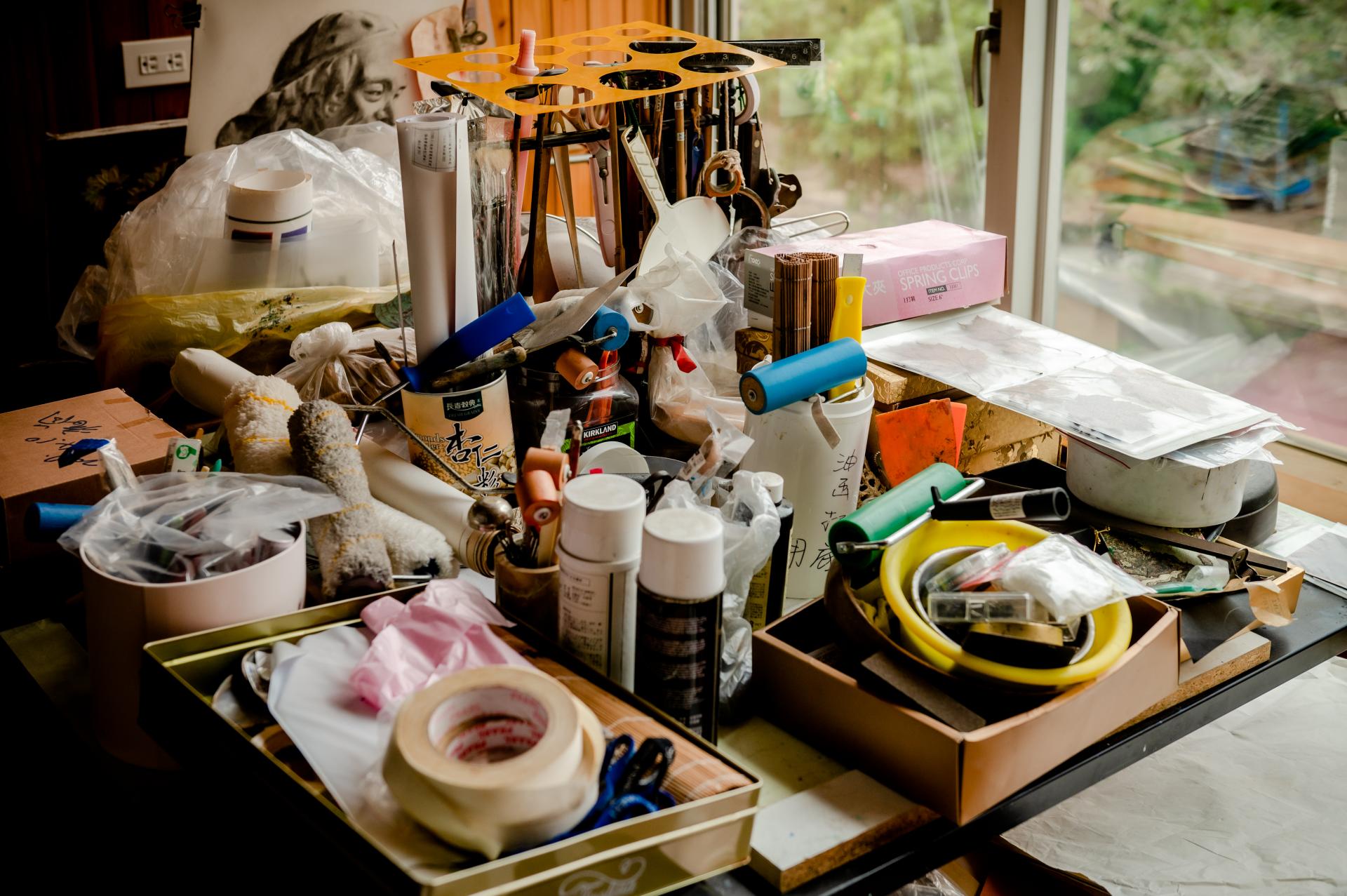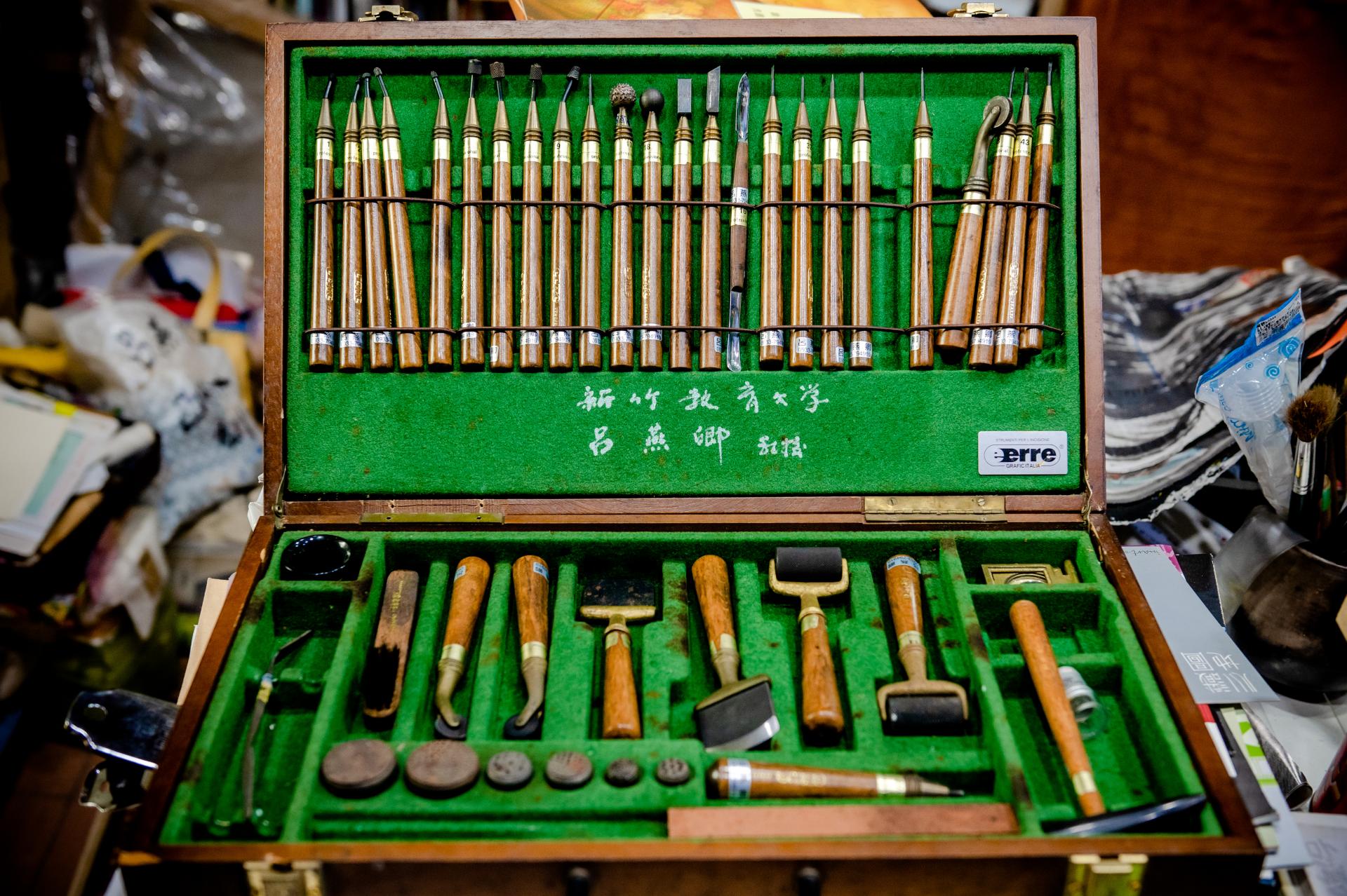 初見呂燕卿老師與師丈張老師,夫妻倆就像家人般親切地招呼。兩人是伴侶,也是最好的夥伴。張老師一手包辦家務、照顧孩子,也協助呂老師準備學校教材,多年來在呂老師的身後給予莫大支持。家裡的擺設與空間利用也以呂老師的藝術創作為優先,不同類型的畫作與畫具有著各自的歸屬,廚房一隅的壁櫥依照色系收納膠彩顏料;光線與通風良好的頂樓則放置油畫的畫架及畫具;若想要創作版畫或藏書票時,就會到固定刻版的地方;書房裡也有好幾櫃藝術相關書籍與教材,隨時可以查找資料。「別人看藝術創作好像很困難,事實上每天做就會變成習慣,這就是我的生活啦!」家裡幾乎每一處角落都成為固定創作的空間,呂老師早已將藝術融入生活,也從生活中汲取靈感,日復一日,持續用畫筆記錄她眼中的美。