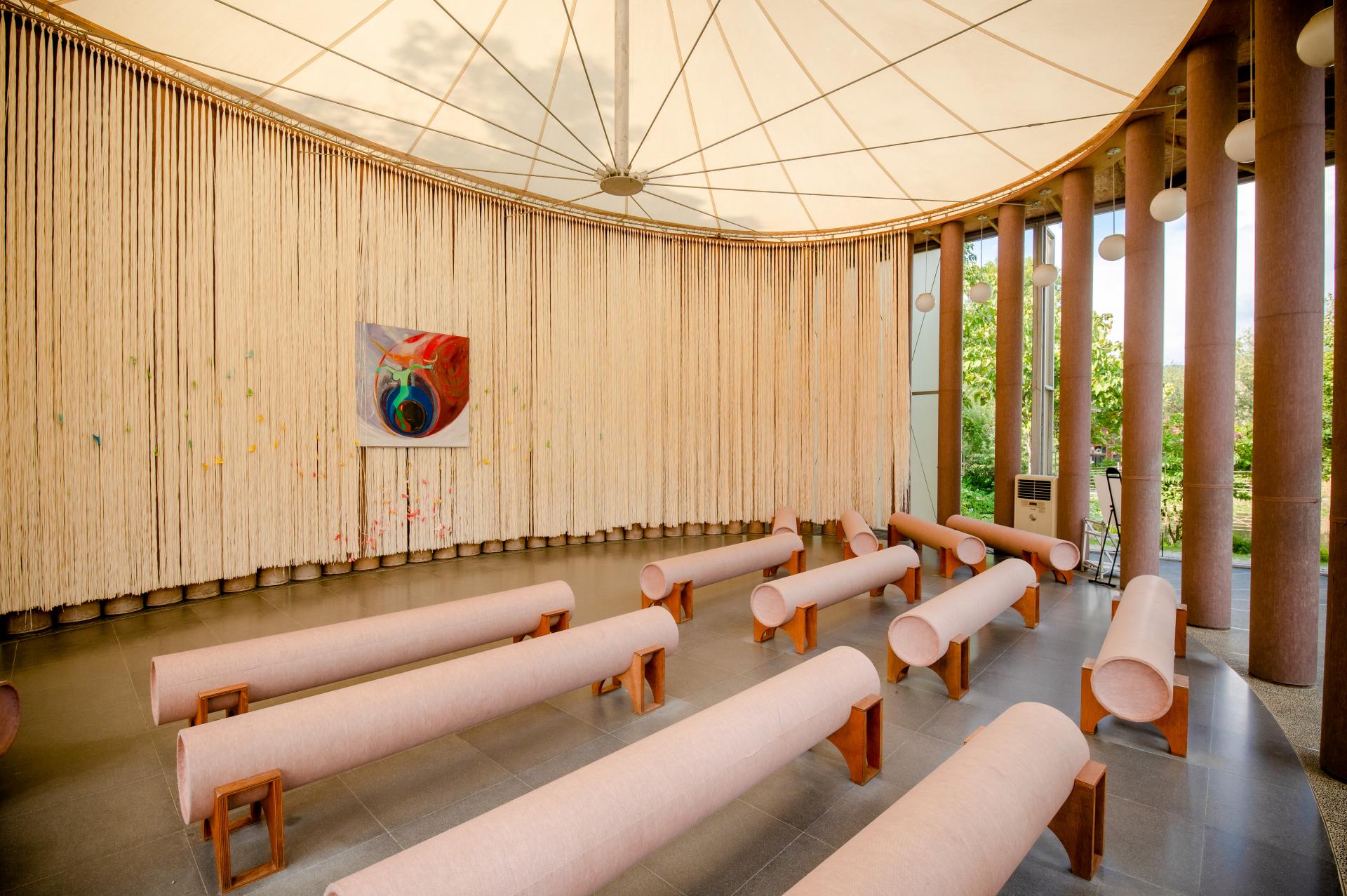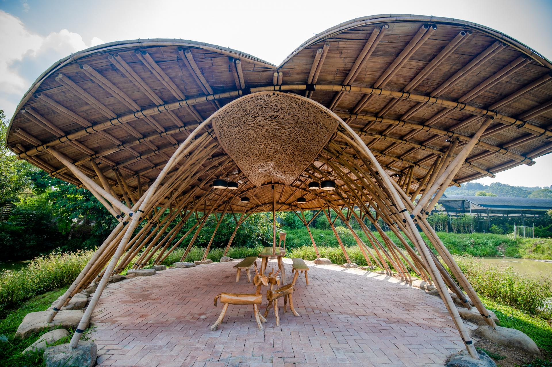 從紙教堂到蝴蝶王國,新故鄉文教基金會與社群的腳步並未停駐於此。基金會近年來聚焦於桃米的另一項重要資產:「竹」。竹子及竹筍是桃米社區最重要的產業之一,桃米更被稱為「筍母」的故鄉,是許多農民購買筍苗的首選。 2019 年,因應即將到訪的世界竹會(因新冠肺炎疫情延期),在水土保持局南投分局的支持下,基金會邀請甘銘源建築師操刀設計兩座竹結構半開放式建築,作為戶外活動及展演空間。以歐蔓、馬兜鈴等蝴蝶蜜源植物為造型,完美融合入桃米的生態氛圍。